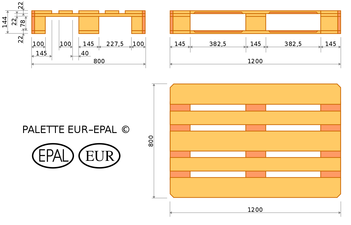 Standart Euro Palet ölçüleri 1200X800X144 mm dir. Euro palette 78-80 çivi özel bir düzenle çakılmıştır.Euro paletin kerestesi Çam veya köknar olmalıdır.Ortalama Euro palet ağırlığı 25 kg ile 35 kg arasında değişir.Euro palet hacmi 45,234 dm3 tür.